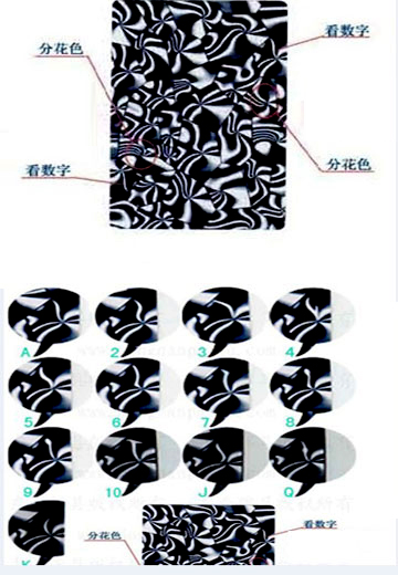 原来密码扑克的反面是由一些非常有规律的四方形排列起来的,在四个方向的角落各有一些规则的小四方形,而且它组成的形状跟正面牌的点数是一样的,这样的话很容易就看出来了,这只是其中一种识别方法,有的牌就有点难度了,不过只要看的多了一眼还是能够看出来的。