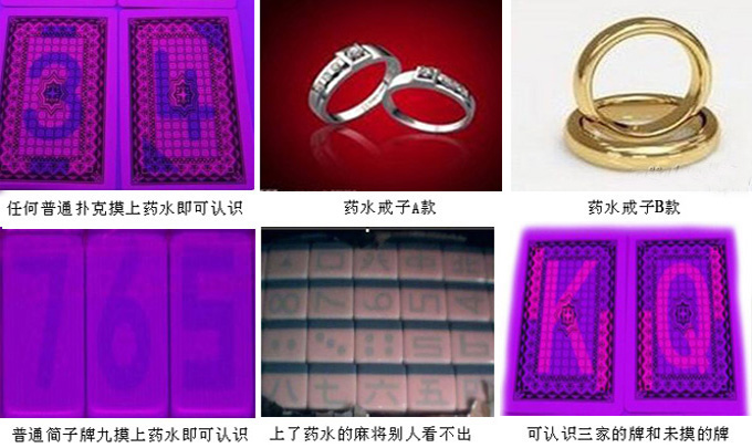 二、不戴隐形眼镜眼看的药水戒子:也就是凭肉眼看的药水戒指,包括一个戒子和一瓶药水。也许大家会问,你凭肉眼可以看到,不是别人也可以看到吗?但事实并非如此,要告诉你方法才能看到,不告诉你方法你永远也看不到,我们经常有客户自己带牌过来,摸上药水后,我们可以快速准确地认出每张牌,但客户把牌拿在手上检查,无论从哪个方向看,都看不出牌上有什么破绽。