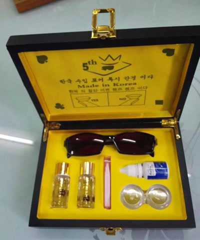 韩国不限光白光眼镜牌具 含水量:78%,透氧系数:9.89DK,度数范围0度,直径:13.5mm,中心厚度:0.026,中心光学区直径:7.8mm,基弧: 8.5mm。经东莞王老师牌具公司加工成白光眼镜,其高质量的品质,高质量的信誉,在竞争激烈的白光隐形眼镜市场享有独特的地位,此镜片适合于白光扑克以及红紫外线扑克,韩国无光线限制具有超薄,舒适的特点。
